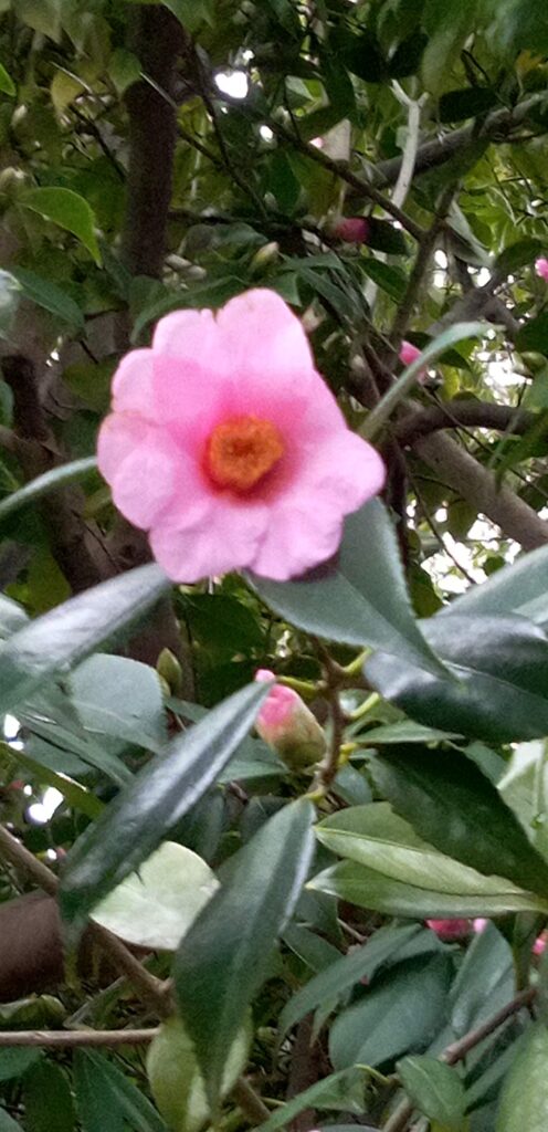 お寺の塀越しに、赤い観音堂のそばに咲くピンクのヤブツバキが顔を覗かせています。小ぶりな花ながら、何とも可愛らしく清楚な佇まいです。